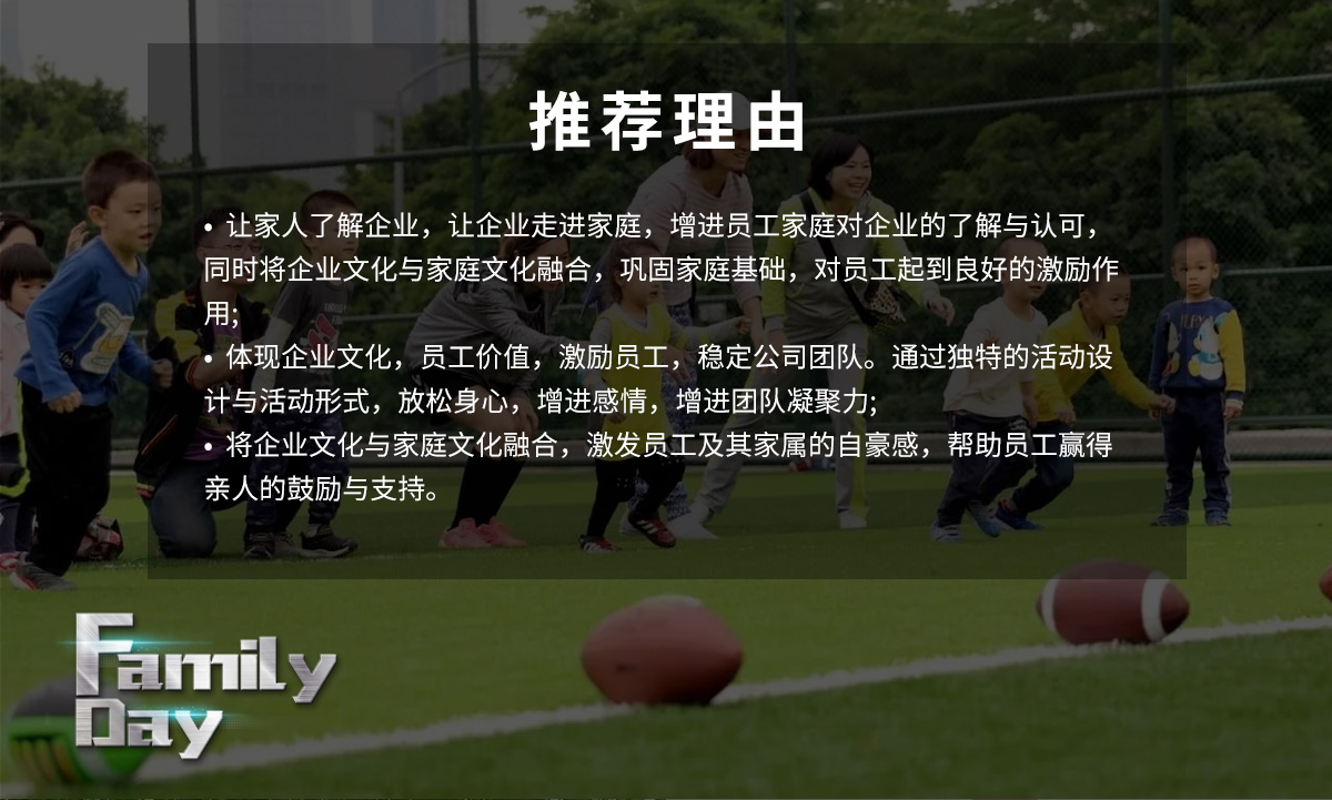 家庭日是企业员工携家属共同参与的欢乐盛会,在轻松愉快的环境中,使员工和家属充分体验企业文化,增进员工之间的交流互动,和对企业的归属感和凝聚力。 丰富精彩的家庭日活动,将企业文化与家庭文化融合,激发员工及其家属的自豪感,帮助员工赢得亲人的鼓励与支持,为企业创造更健康快乐的工作氛围。